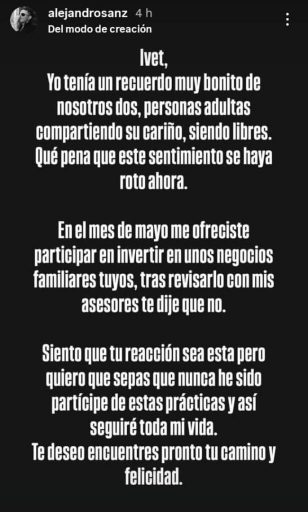 Sanz revela que en mayo, la joven le ofreció invertir en unos negocios de su familia, petición a la que se negó el intérprete, por lo que cree que lo revelado por Ivet es una reacción a su negativa, y deja claro que no es partícipe de “estas prácticas”.