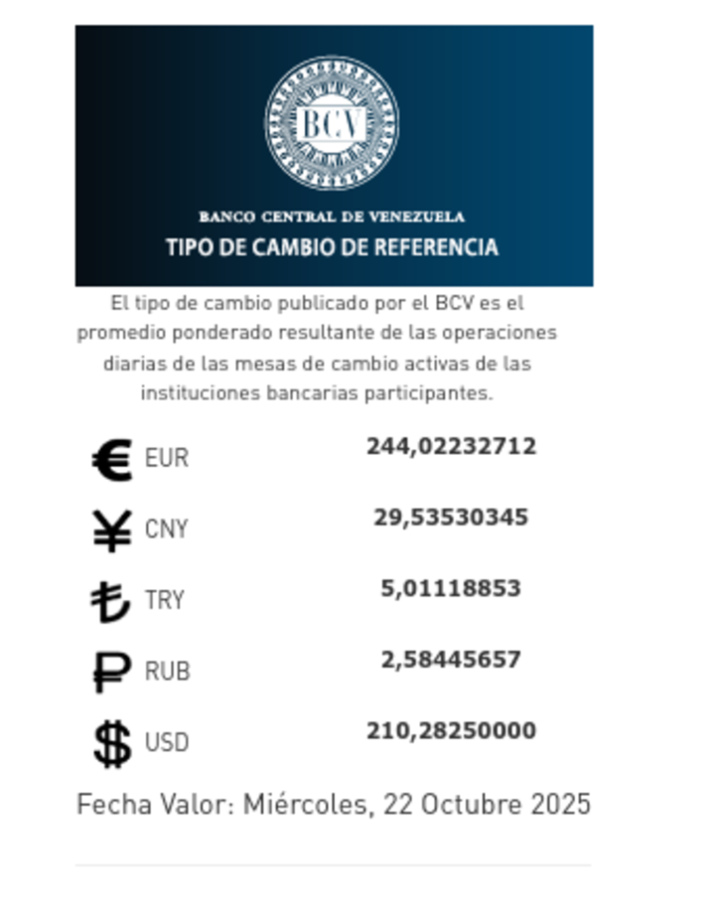 El Banco Central de Venezuela (BCV) informó hoy un incremento moderado en el precio de las divisas oficiales, en comparación con el cierre de la jornada anterior. La moneda estadounidense se cotiza para este domingo 22 de octubre en 210,28 bolívares por dólar, mientras que el euro fue establecido en 244,02 bolívares.