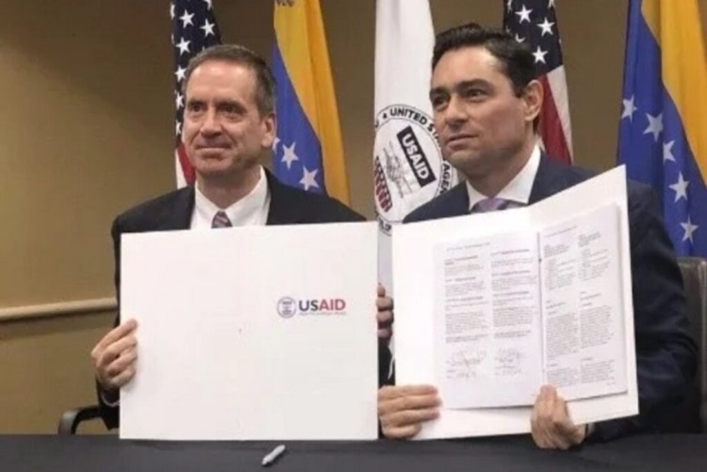De acuerdo con los archivos filtrados, la Usaid firmó en 2019 un acuerdo con el «Gobierno interino» de Guaidó para proveer 98 millones de dólares en «ayuda humanitaria». En el acto de firma de este acuerdo estuvo presente Vecchio en su condición de «embajador» en Washington.