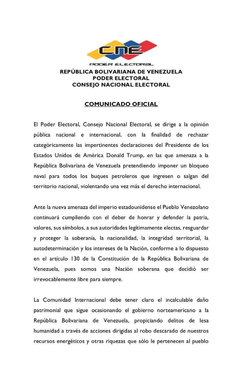 El Consejo Nacional Electoral (CNE) emitió este jueves un contundente comunicado en el que rechazó “categóricamente” las recientes declaraciones del presidente de Estados Unidos, Donald Trump, quien habría amenazado con imponer un bloqueo naval contra los buques petroleros venezolanos.