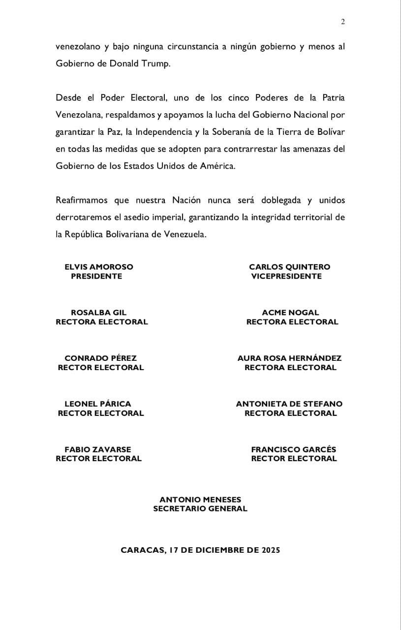 El ente rector electoral calificó las palabras del mandatario norteamericano como “impertinentes” y afirmó que tal medida “violentaría una vez más el derecho internacional”. Asimismo, señaló que el pueblo venezolano “continuará cumpliendo con el deber de defender la patria”, en apego al artículo 130 de la Constitución, por ser “una Nación soberana que decidió ser irrevocablemente libre para siempre”.