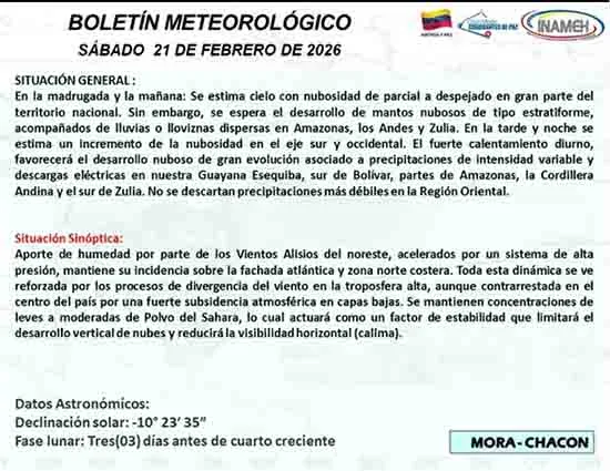 Se prevén mantos nubosos estratiformes acompañados de lluvias y lloviznas dispersas en las primeras horas de la mañana, específicamente en los estados de Zulia, Amazonas y en la región andina. Sin embargo, se anticipa que hacia la tarde y noche, un fuerte calentamiento diurno generará la formación de núcleos nubosos que podrían provocar lluvias de intensidad variable y descargas eléctricas en áreas específicas como la Guayana Esequiba, el sur de Bolívar, Amazonas, los Andes y el sur del Zulia.