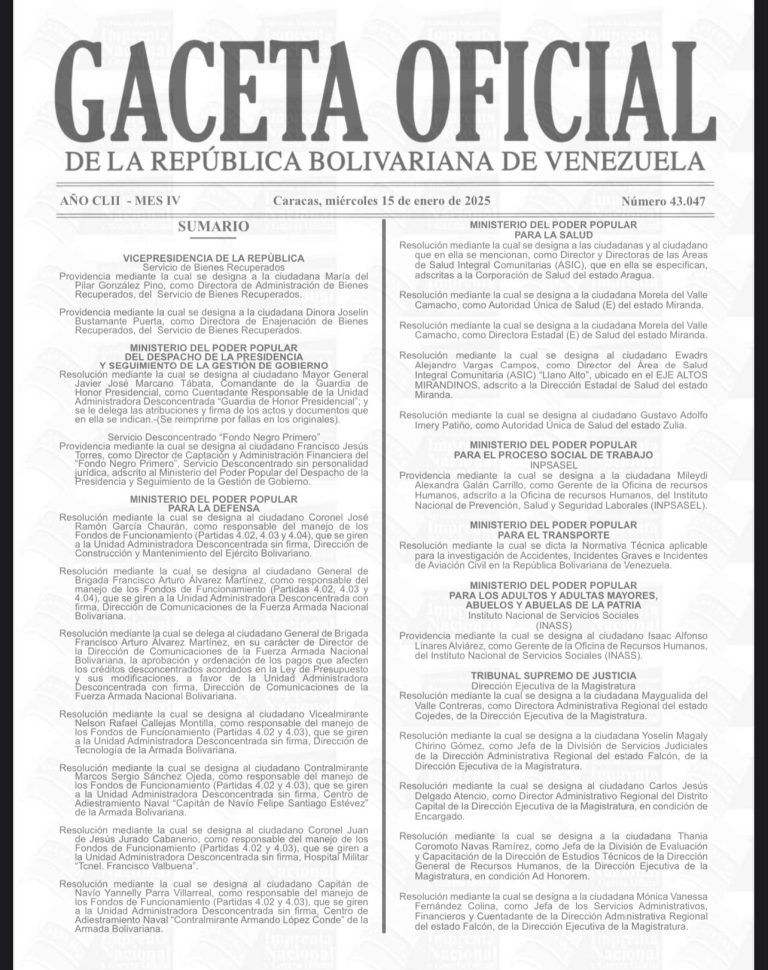 La designación quedó plasmada en la Gaceta N° 43.047, con fecha del miércoles 15 de enero de 2025.