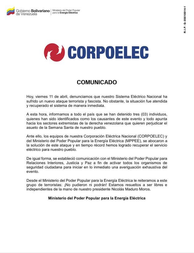 El Gobierno Nacional, mediante un comunicado oficial, denunció un nuevo ataque terrorista contra el Sistema Eléctrico Nacional (SEN). Según las autoridades, el objetivo de este sabotaje era afectar el asueto de Semana Santa del pueblo venezolano.