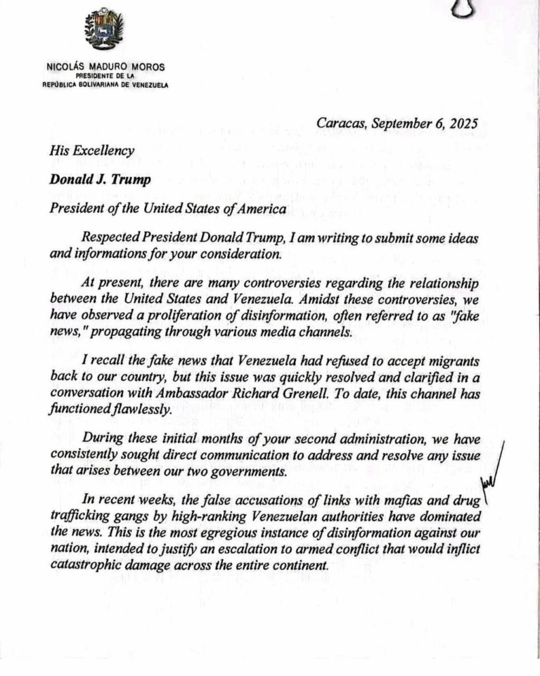 La Vicepresidenta Ejecutiva de Venezuela, Delcy Rodríguez, hizo pública este domingo 21 de septiembre una carta que el presidente Nicolás Maduro envió a su homólogo estadounidense, Donald Trump, con fecha del 6 de septiembre de 2025.