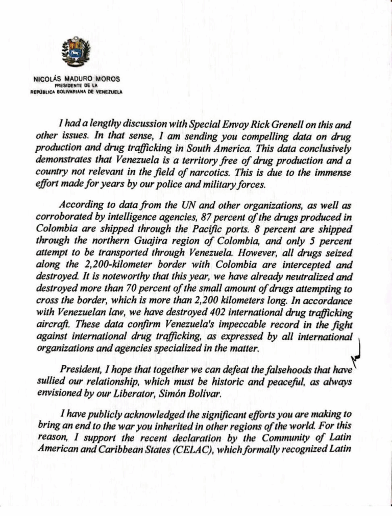 En la misiva, Maduro alude a las “muchas polémicas” en la relación bilateral y a las denominadas “fake news” que, según él, circulan en los medios de comunicación.