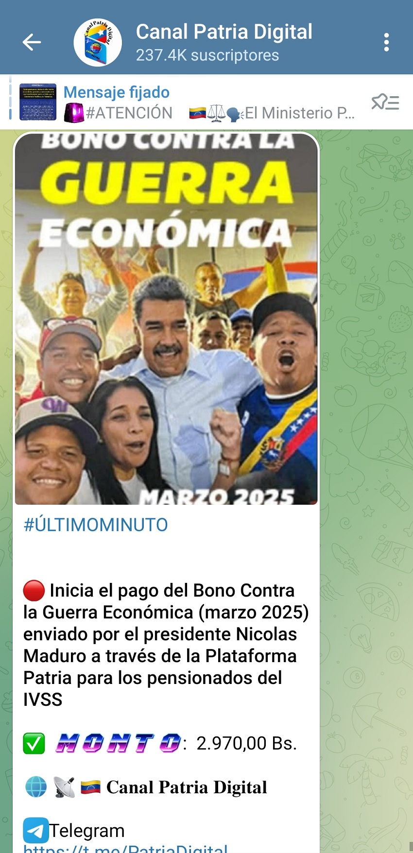 El Canal Patria Digital destacó que el monto otorgado es de Bs. 2.970 o US$ 43,47 al tipo de cambio vigente del Banco Central de Venezuela (BCV).