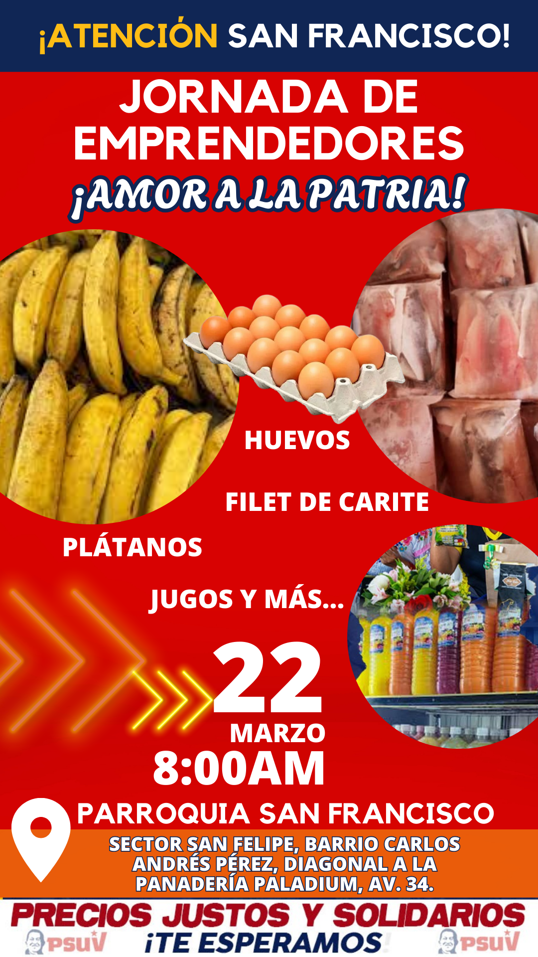 Este sábado 22 de marzo, la Parroquia San Francisco será el punto de encuentro para la Jornada de Emprendedores “Amor a la Patria”, una iniciativa que busca ofrecer productos de primera necesidad a precios justos y solidarios para la comunidad. El evento organizado por representantes del Partido Socialista Unido de Venezuela (PSUV), dará inicio a las 8:00 de la mañana, se llevará a cabo en el sector San Felipe, Barrio Carlos Andrés Pérez, diagonal a la Panadería Paladium.