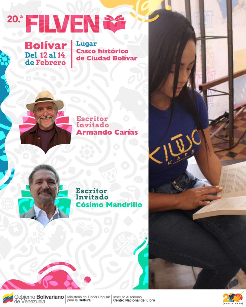 La 20.ª Filven, fiesta del libro y la lectura más importante de Venezuela, abre sus puertas con una amplia jornada literaria, desde este 12 al 14 de febrero, en el casco histórico de Ciudad Bolívar, estado Bolívar, en homenaje a los escritores regionales Yusmira García y Saúl Rivas.