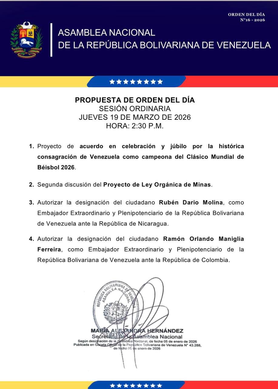Asimismo, el parlamento presentará un proyecto de acuerdo para celebrar y rendir homenaje a la histórica consagración de Venezuela como campeona del Clásico Mundial de Beisbol 2026, un evento que ha llenado de orgullo a la nación y se destaca como un hito en el deporte nacional.
