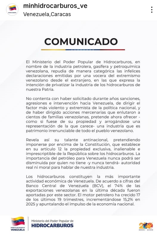 En un comunicado oficial emitido este miércoles, el Ministerio para Hidrocarburos, liderado por la recién designada Paula Henao, expresó su firme rechazo a las declaraciones de la dirigente opositora María Machado, quien ha manifestado desde el extranjero su intención de privatizar los recursos energéticos del país. La institución calificó estas propuestas como “antinacionales” y “infelices”, y advierte que atentan contra la soberanía y el patrimonio del pueblo venezolano.