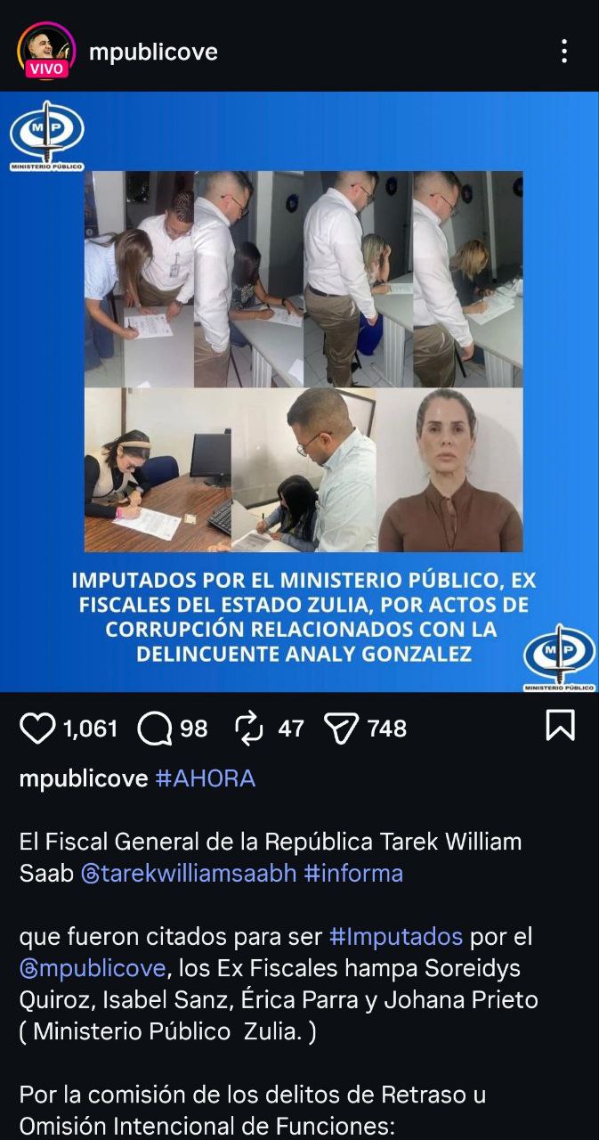 El Fiscal General de la República, Tarek William Saab, informó este jueves sobre la citación e imputación de cuatro exfuncionarias del Ministerio Público en el estado Zulia, por su presunta participación en graves hechos de corrupción vinculados a la ciudadana Analy González, actualmente detenida.