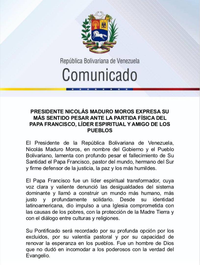 21-04-2025-El presidente de la República Bolivariana de Venezuela, Nicolás Maduro Moros, en nombre del Gobierno Bolivariano y el pueblo venezolano, manifestó su más sentido pesar por el fallecimiento de Su Santidad el Papa Francisco, destacando su legado como líder espiritual y defensor de los más necesitados.