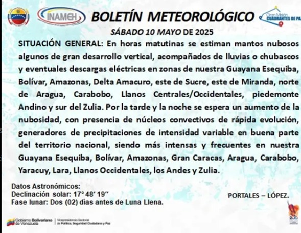 Las zonas más afectadas por lluvias persistentes y fuertes serán nuestra Guayana Esequiba, Bolívar, Amazonas, la Gran Caracas, Aragua, Carabobo, Yaracuy, Lara, Llanos Occidentales, la región andina y Zulia.