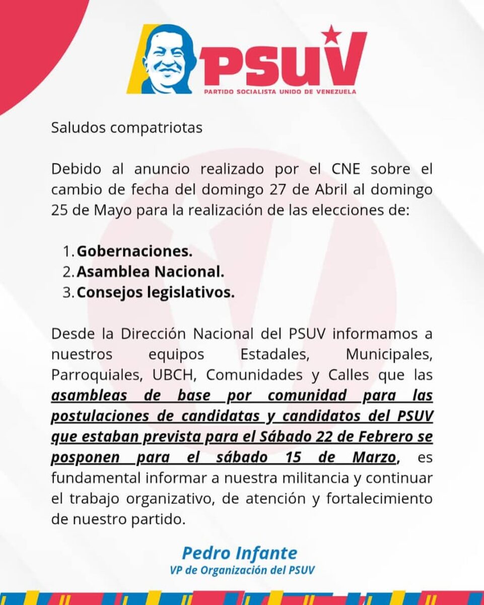 En un «Aviso Importante» difundido a través de Instagram por el vicepresidente de organización del PSUV, Pedro Infante, se informó que las asambleas comunitarias para la postulación de candidatos, inicialmente programadas para el sábado 22 de febrero, se realizarán ahora el sábado 15 de marzo.