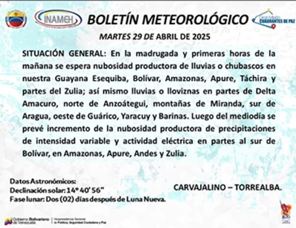 En la madrugada y primeras horas de la mañana se espera nubosidad productora de lluvias o chubascos en nuestra Guayana Esequiba, Bolívar, Amazonas, Apure, Táchira y algunas partes del Zulia.