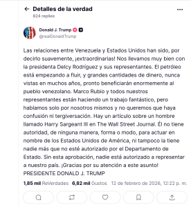 “Las relaciones entre Venezuela y Estados Unidos han sido, por decirlo suavemente, ¡extraordinarias! Nos llevamos muy bien con la presidenta Delcy Rodríguez y sus representantes”, afirmó Trump, sugiriendo una nueva era de entendimiento entre ambas naciones.