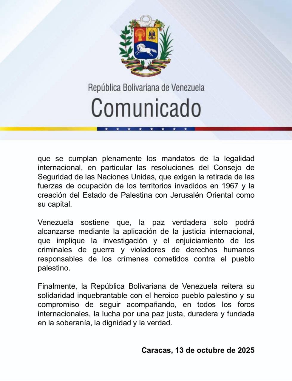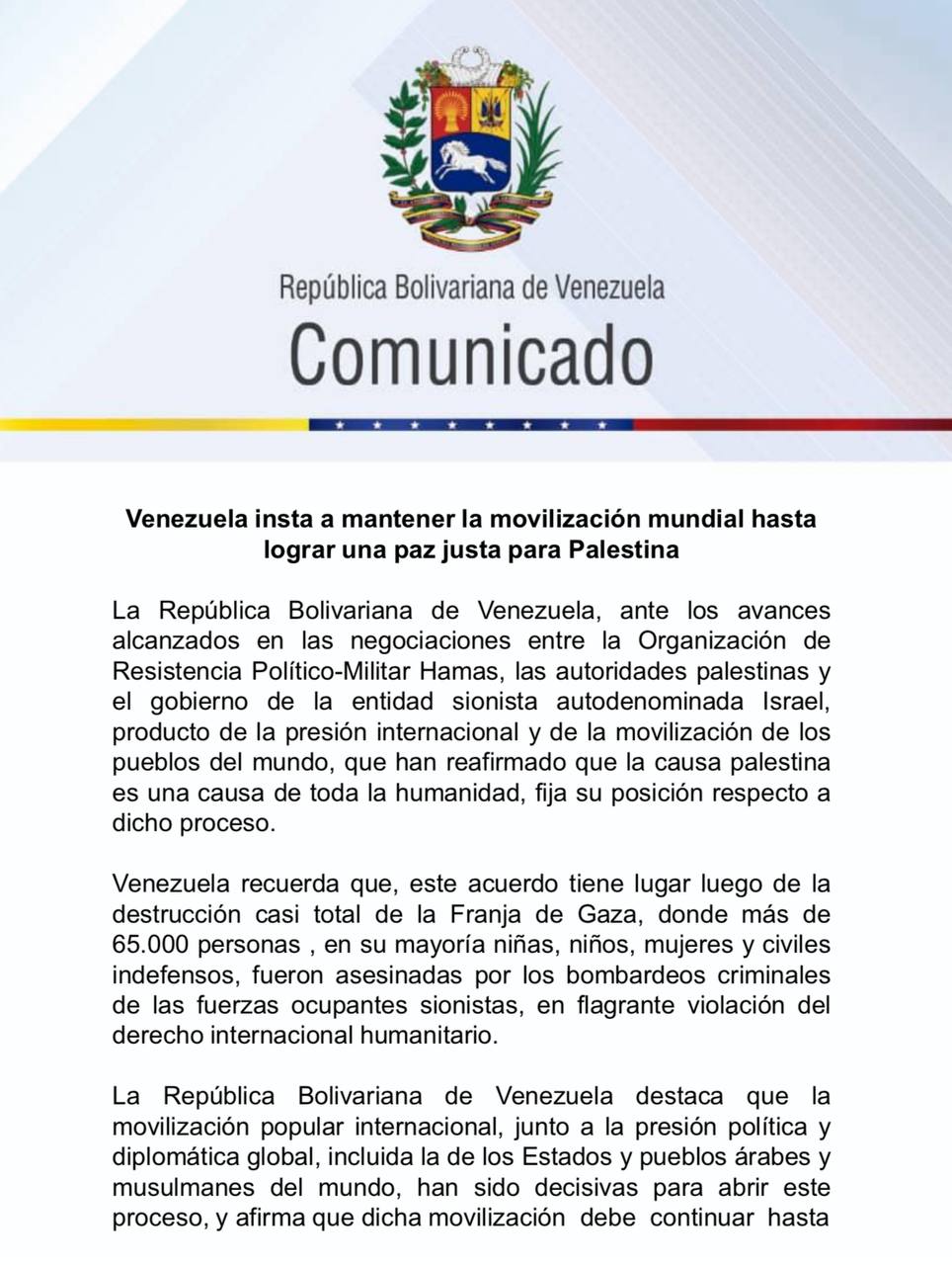 En un comunicado oficial emitido este miércoles, el Gobierno de la República Bolivariana de Venezuela hizo un llamado urgente a la comunidad internacional para sostener y fortalecer la movilización mundial hasta conseguir una paz justa y duradera para el pueblo palestino.