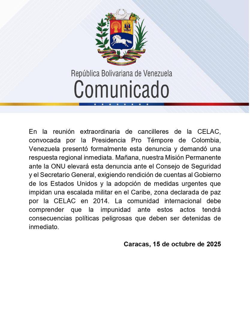 Como respuesta inmediata, el Ejecutivo de Caracas anunció que su Misión Permanente ante la ONU elevará formalmente esta denuncia ante el Consejo de Seguridad y el Secretario General de la organización. El objetivo, según el comunicado, es exigir “rendición de cuentas al Gobierno de los Estados Unidos y la adopción de medidas urgentes que impidan una escalada militar en el Caribe”, una zona que fue declarada de paz por la Comunidad de Estados Latinoamericanos y Caribeños (CELAC) en 2014.
