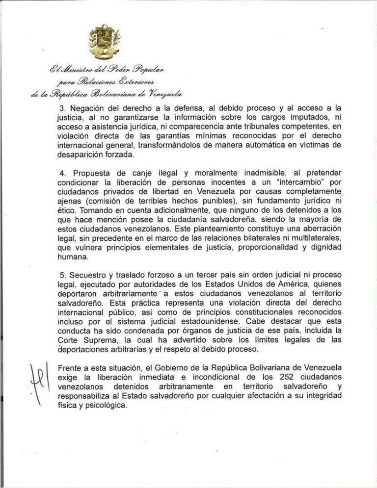 El Gobierno venezolano, a través del canciller Yván Gil, exigió a El Salvador la liberación inmediata e incondicional de 252 venezolanos detenidos, responsabilizando a las autoridades salvadoreñas por cualquier daño a su integridad física y psicológica. En una carta enviada a la Cancillería de El Salvador, Venezuela denunció que estas detenciones representan graves violaciones a los derechos humanos y calificó de “ilegal y moralmente inaceptable” la propuesta de intercambio planteada por el gobierno de Nayib Bukele.