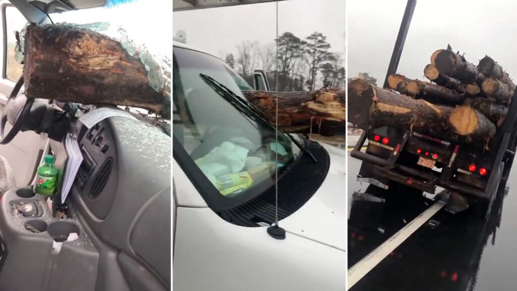 Un hombre conducía una furgoneta por una carretera de EE.UU. detrás de un camión cargado de troncos cuando, de repente, uno de estos salió volando hacia su vehículo y se empotró contra el centro del parabrisas. Se informa de que el conductor salió ileso.